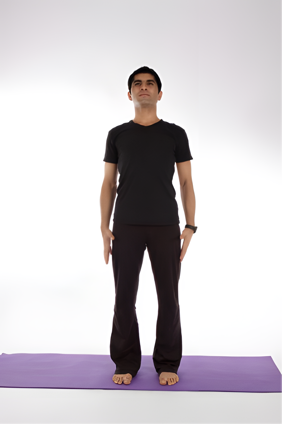 De ge-aarde houding = voeten iets uit elkaar, armen en handen los naast het lichaam, rechte rug en hoofd rechtop.