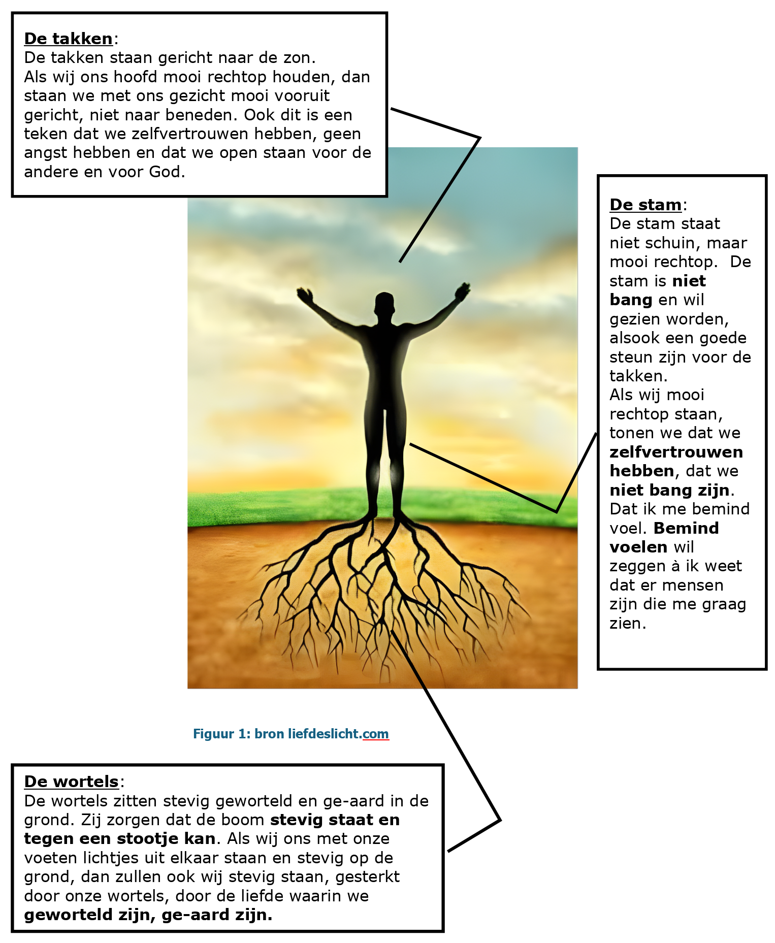 Het is de houding die we in de vormselviering aannemen, telkens als we rechtstaan. Het is de houding die we aannemen als we voor de vormheer staan. Met deze houding zeggen we: “Ik ben niet bang, niet beschaamd. Ik kan mezelf zijn. Ik heb vertrouwen. Ik weet dat ik bemind bent, aanvaard. Ik sta stevig. Ik ben ge-aard in liefde.”
