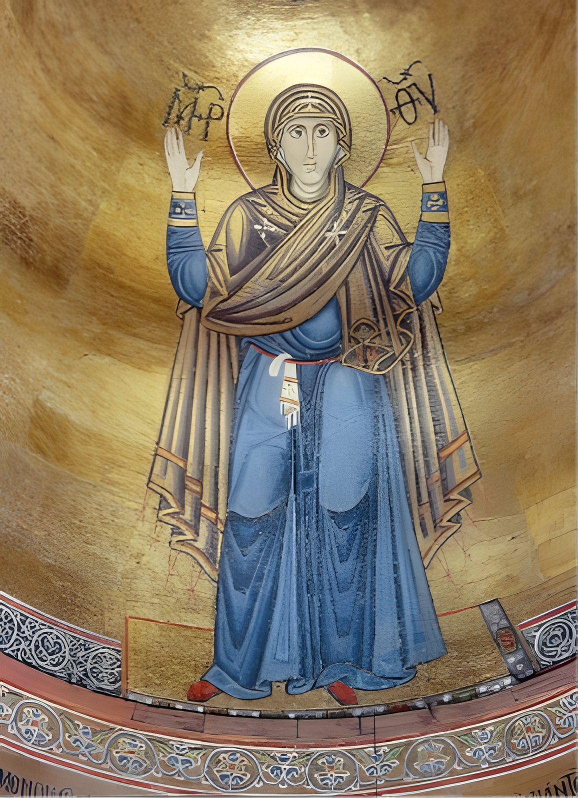 Dit is een oud mozaïek van Maria, de moeder van Jezus.